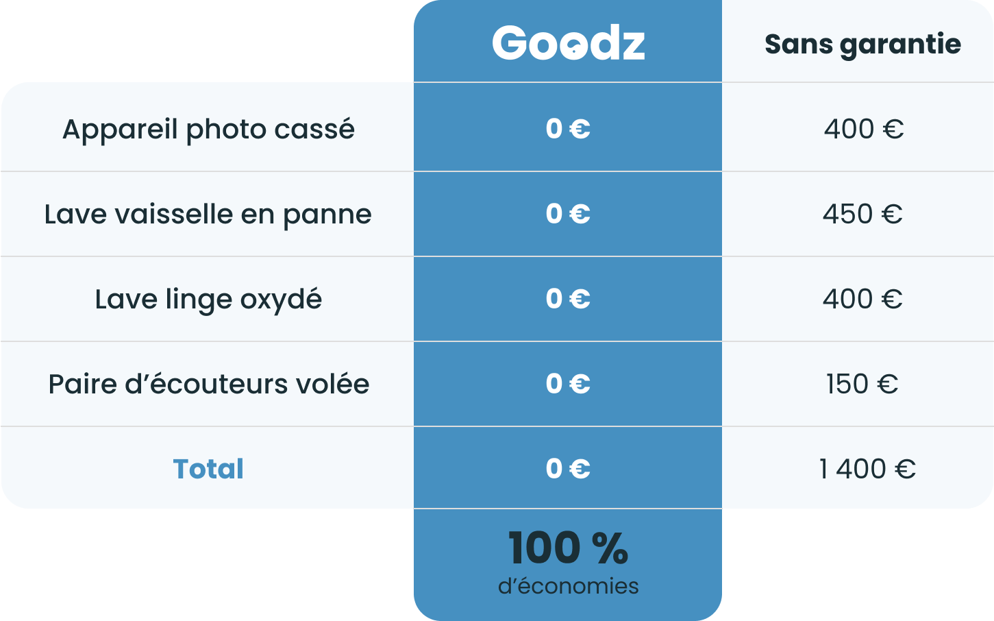 La casse, l’oxydation, la panne, le vol caractérisé* et la perte accidentelle* sont couverts par votre assurance Goodz.